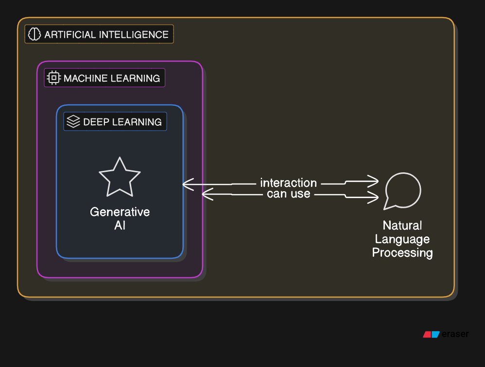 - Generative AI sits at the intersection of AI and deep learning, focusing on models that create new content, and can be used in NLP for tasks like text generation.